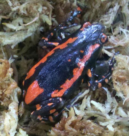 This frog has shiny black or dark brown skin with continuous or interrupted vivid red or orange bands extending from the snout over the eyelids to the back of the body.